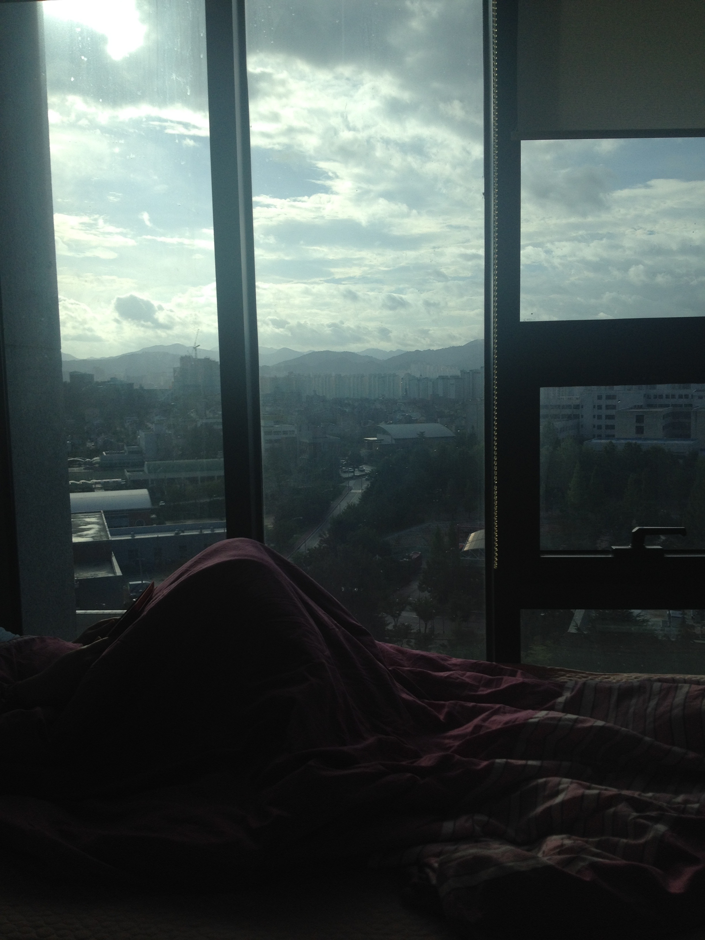 So, once we got to Jeonju we were herded around to sign in, get our temperature checked, pick up some snacks, and sent to our rooms where, for the most part, we crashed. Hard. Here’s the view from my room: