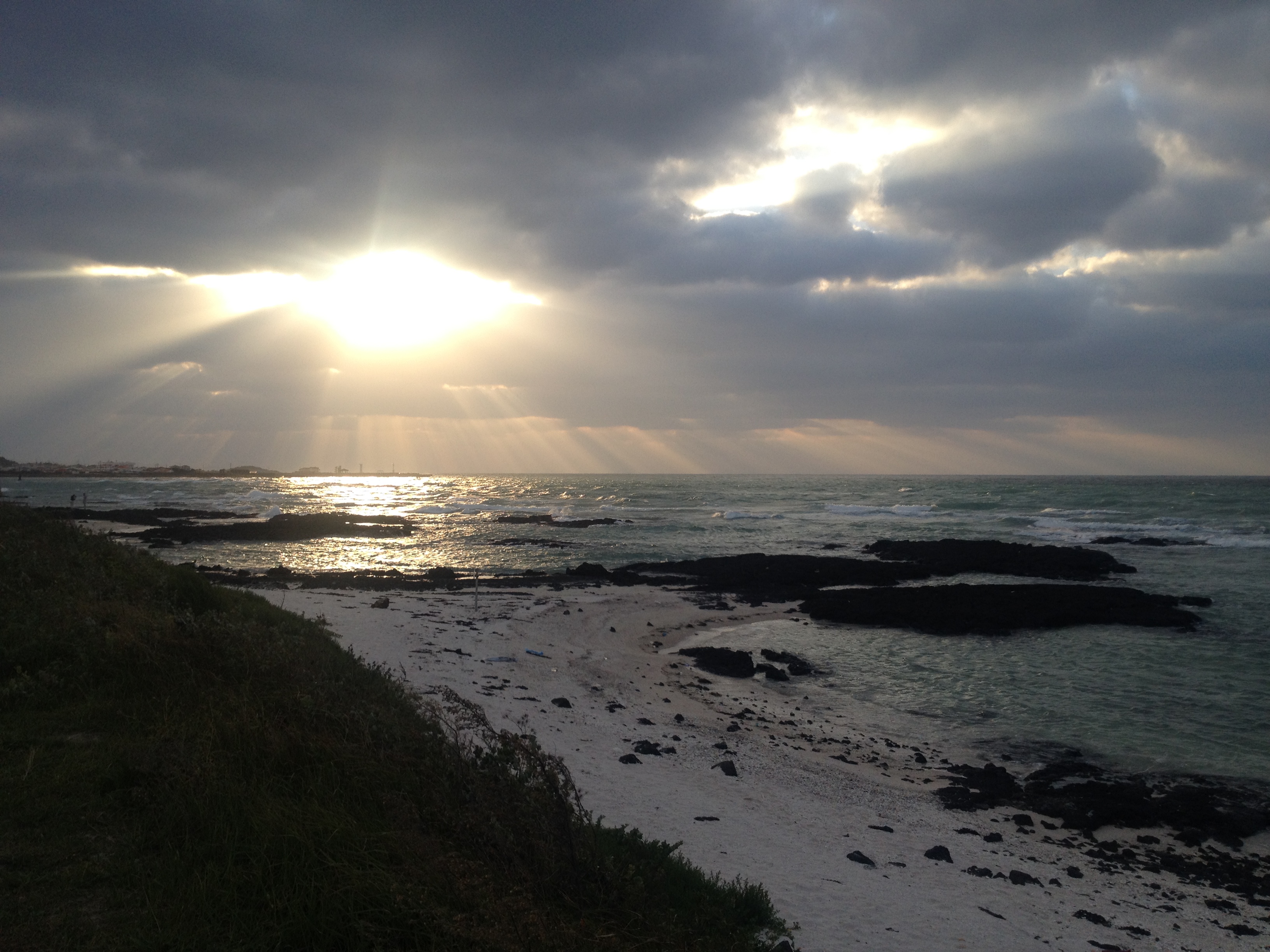 The mountain behind me in that third picture above is Halla-san, the highest mountain in Korea. She’s covered in clouds here, but we got a great view of her later in the weekend. After “brunch” we headed to the beach near Seogwipo where we would be camping for the night. It was getting chilly and the clouds rolled in but sunset, as always, did not disappoint.